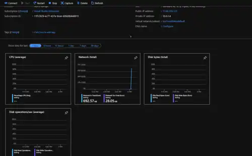 The Azure portal includes various monitoring tools so that you can easily track the performance of your VM without having to log in manually. This can prove very helpful for high-load computational tasks where you don't know when the task will finish (as you can use the monitoring platform to track the usage - if it drops off drastically, then the task is most likely done) or to check for unexpected load leaks. You can also configure this by duration.