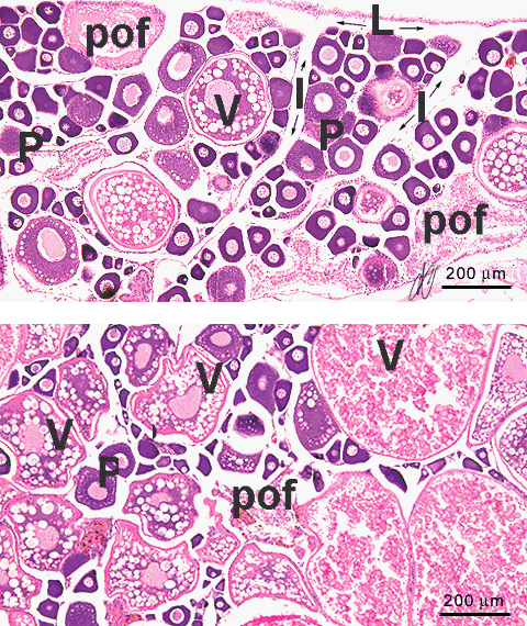 | Two specimen of normal adult zebrafish ovaries, in different stages of the spawning cycle. The upper specimen shows a high ratio of previtellogenic oocytes [P], suggestive for an early postspawning stage, whereas the lower specimen contains predominantly vitellogenic oocytes [V], indicating an intermediate stage. The postspawning condition of the upper specimen is further indicated by the high ratio of postovulatory follicles [pof]. Note, that the upper image shows a lobulated structure, with interlobular spaces [I] that communicate with the lateral oviduct [L]. Thus, the interlobular spaces give way to ovulated oocytes. |