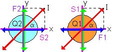 x and y are chosen parallel to the axis the quarter-wave plates. Both plates are mounted perpendicular, α is the angle of incoming polarization, φ is the phase difference caused by path length difference