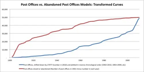 This model fits the post office data much better than simply the number of post offices from 1901 to 2010. Model 1b has values of 0.941 for the post office closure data and 0.747 for the number of post offices data. Model 2b has values of 0.965 for the post office closure data, again compared to 0.790 for the number of post offices.