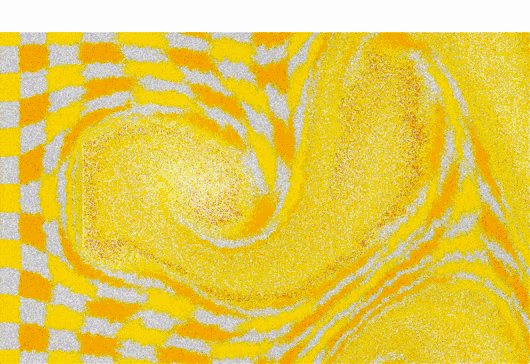 Hard disks subject to gravity bounce on each other. The large yellow disk experiences greater pressure at its base than at its top. This is why it is carried by the fluid like a hot air balloon.