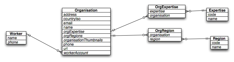 This model shows a number of entities and the lines between the entities show relationships. For example, the Organisation entity has a to-one relationship with a Worker called "workerAccount" and it also has a "to-many" relationship to "OrgRegion" called "orgRegions".