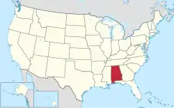 Alabama is a state located in the southern region of the United States. It is bordered by Tennessee to the north, Georgia to the east, Florida and the Gulf of Mexico to the south, and Mississippi to the west. The capital of Alabama is Montgomery and it's largest city is Huntsville. Other big cities in Alabama include Birmingham and Mobile. Residents are known as Alabamians or Alabamans.