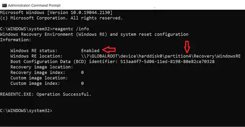 Figure B: Checking the status of the Recovery Environment. The display shows that it is enabled, and that the location of the file is hidden partition four, the usual recovery partition. That is to say, all is well.