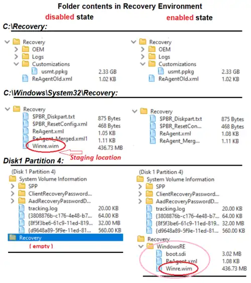 Figure D: Shows the changes in file locations when the RE is enabled and disabled. When enabled, The Winre.wim file in the staging location is moved, with other files, to its working location in the recovery partition. It is moved back when disabled.