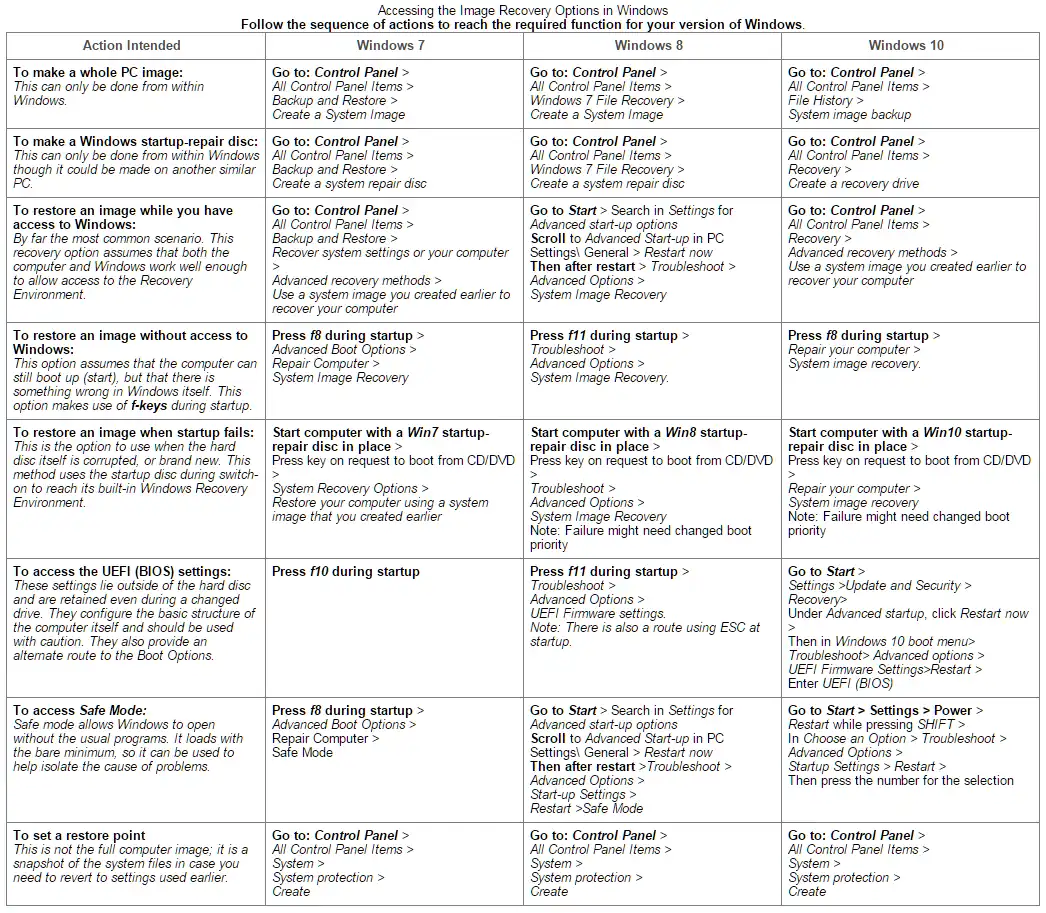This page describes the actions to take for the making and restoration of whole-computer images. In particular, details are given on how to access the Windows Recovery Environments of Windows 7, Windows 8, and Windows 10.