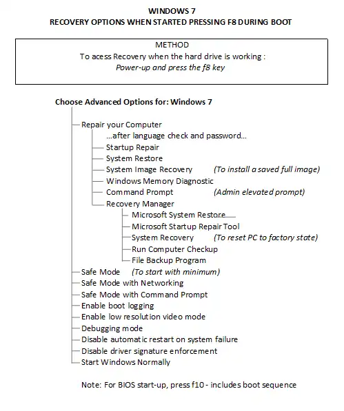 - The second drop-box, Specific Recovery Options for Windows 7 displays facilities, the details of which have been arranged in a tree format that show the route to any function from the starting point. Three sections were necessary; one for starting within Windows, another for the f8 start during bootup, and one where a startup-repair disc is required.