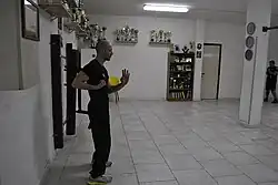- Perform a left hand Side Palm Strike at rib level. Turn palm up, Huen Sau, and return left hand to rest position.