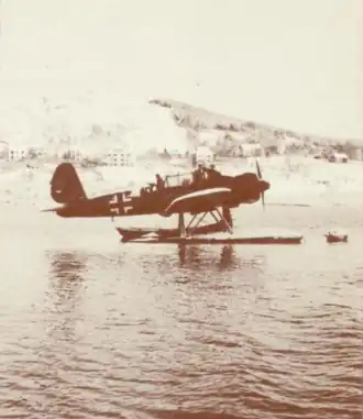 Luftwaffe started looking for a site for an airport between Bergen and Trondheim in January 1941. At first they suggested Spjelkavik, but this was changed and Aukra Airport, Gossen built instead. However, the Luftwaffe still needed a base for seaplanes to operate near Ålesund.[10] For this they carried out the plans which the Naval Air Service had made and erected a seaplane base later in 1941.[6] This was at first built at Nørvevika, but was later relocated slightly to Sørneset. The ships were anchored to a buoy and a barracks was built on land.[11] It was manned with two Arado Ar 196 of 2. Kustenfliegergruppe 406. One of these crashed on 18 March 1943 at Rambjøra in Haram Municipality, killing both on board.[12] The second crashed at Volsdalen in Ålesund on 18 October.[13]
