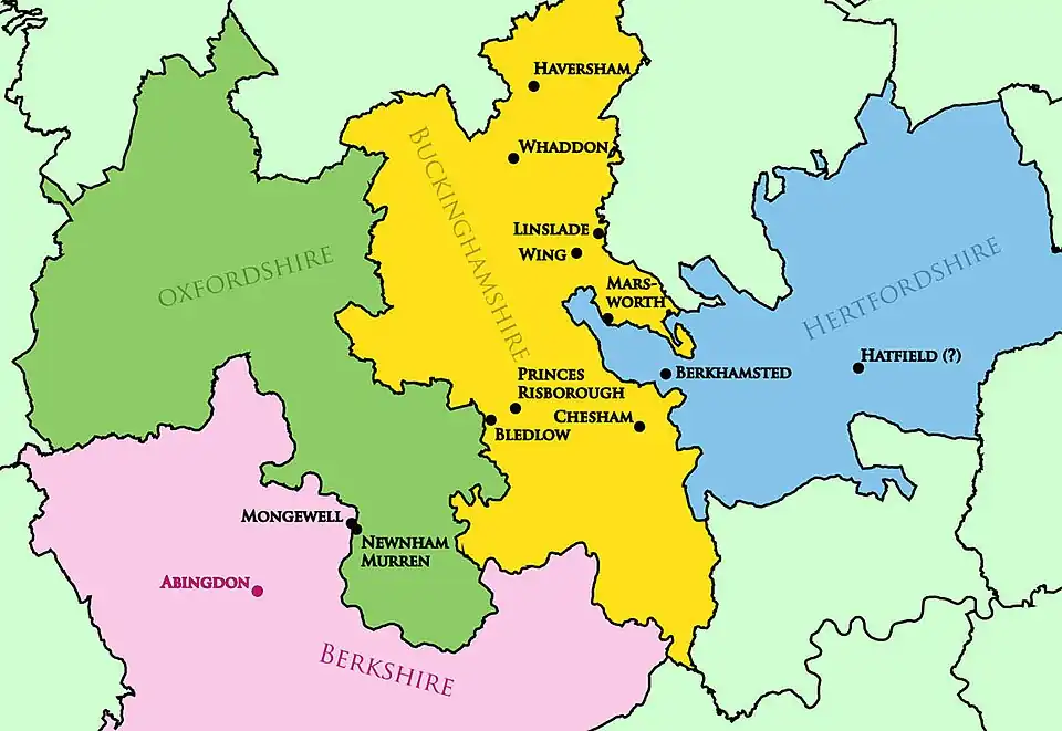 Locations of Ælfgifu's estates and Abingdon, shown within the modern counties Oxfordshire, Buckinghamshire, Berkshire and Hertfordshire. The estate south of Winchester, Gussage (Gysic) in Dorset, is not shown here.