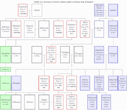 Two genealogical hypotheses (green and blue) for the connection between Ælfgifu and Eadwig, combined in a diagram