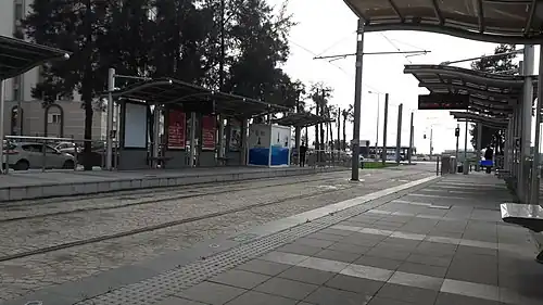 Çevreyolu is a light-rail station on the Karşıyaka Tram line of the Tram İzmir network. The station consists of two side platforms serving two tracks. Çevreyolu is located on 8291st Street, just off of Caher Dudayev Boulevard, in Ataşehir, Çiğli and gets its name from the O-30 beltway (Turkish: Çevreyolu) running just north of the station. Çevreyolu station was opened on 11 April 2017, along with the entire tram line.