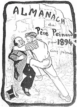 After his release from prison, Pouget edited the anarchist bimonthly Ça ira from 27 May 1888 to 13 January 1889, in collaboration with former Communard Constant Martin.[9] He became a regular at meetings of the Cercle Anarchiste International, which gathered in Paris' 15th arrondissement to discuss tactics including the general strike and a potential alliance with the Bourse du Travail labor councils.[10] On 24 February 1889, he established his iconic newspaper, Le Père Peinard.[9][2] Reminiscent of Rochefort's La Lanterne (The Lantern), the paper was published in small pamphlet form. It was written in working-class French slang and was inspired in tone by Jacques Hébert's Le Père Duchesne, popular during the Reign of Terror.[8] In a September 1889 edition of Le Père Peinard, Pouget praised the London dock strike, marking the first step in his evolution into syndicalism. However, at this time, he criticized the British workers' formal association into labor unions and especially the unions' parliamentary orientation and reformism.[11]