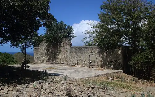 To prevent further British ambitions, King Louis XVI ordered the construction of fortifications on Les Saintes. Thus began the construction of "Fort Louis" on the Mire Hill, "Fort de la Reine" on Petite Martinique island, the watchtowers of "Modele tower" on Chameau Hill (the top of the archipelago, 309 m), the artillery batteries of Morel Hill and Mouillage Hill, in 1777.[1]