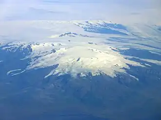Öræfajökull has erupted twice in historical times, in 1362 and 1728. These were explosive silicic eruptions with bulk tephra volumes of 0.1–10.0 km3 (0.024–2.399 cu mi) and jökulhlaups occurred.[2] The deposits closer to the central volcano are rhyolytic but the more distal lava flows which can extend for 20 km (12 mi) from the caldera are alkali olivine basalt and both have been erupted in the Holocene.[2]
