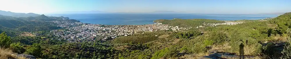 The town reaches approximately 100 m (330 ft) at its highest elevation,[19] with mountainous terrain surrounding it to the north within the peninsula. This is a result of Turkey's fault block features – the convergence of the Anatolian Plate against that of the Aegean Sea Plate – and the wide range of mountains in western Turkey and the Aegean Region surrounding the Büyük Menderes River to the south, collectively referred to as the Menderes Massif.[20]