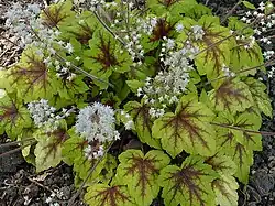 Heucherellas take their brilliant foliage colors from the Heuchera parents and the dark leaf patterns and cut-leaf shapes from the Tiarella parents. They are often called by their botanical name × Heucherella, but the common name in the USA is "foamy bells" because the common names of the parent plants are "coral bells", and "foam flower" respectively. Flowers may be white, pink or cream, and usually appear in spring.