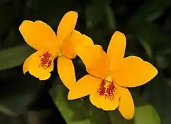 - Laeliocattleya (syn. Cattleya) Dorset Gold – Has flowers with yellow petals edged with crimson. The lip is ruffled and is red-purple, with gold streaks along the throat.[3]
