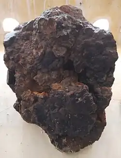 The Manganese Ore is the main component of the formation, and its distinctive characteristic element.[13] The Úrkút Manganese ores occur on marine sedimentary rocks composed mainly of bioclastic Limestone, radiolarian Clay Marlstone, and dark-gray to Black Shale. The Origin of the Local Manganese Ores based on the presence of siliceous manganese ores and antauthigenic Silica points to the volcanogenic-sedimentary origin of this Mn-ore deposits[14] Manganese nodules are widely distributed in the area in Jurassic rocks, mainly on the Lower Jurassic, but younger nodules also occur.[13] The Black Shale with Mn-carbonate get its maximum deposition on the Toarcian, concretely during the Tenuicostatum–Falciferum Ammonite zones in the coeval Sachrang Formation, Strubberg Formation and Allgäu Formation in the Northern Calcareous Alps and the Eastern Alps (Austria, Germany and Switzerland), while Úrkút and related deposits were the regional equivalent in the Transdanubian Range.[13] There are other deposits with Shale and associated Mn particles on contemporaneous oxic deposits occur that formed under similar environmental conditions.[15] The Úrkút Manganese deposit has been investigated geologically, mineralogically and chemically.[16] It has several properties, including very fine grain size (~ 1 μm), an enrichment of metals over a geologically very short time (-500 thousand years). Both Metals and the Manganese have been related with local hydrothermal vent systems, where the metal enrichment was a result of microbial activity.[17] There are at least three types of Manganese deposits that occur close in proximity. The first, those with cherty Fe–Mn-oxide ore, developed on the margins of the much larger carbonate ore body, whose origin has been related with proximal fracture systems, being composed by varicolored metalliferous Claystone. Other type includes the so-called Csárda-hill, where it is very cherty and iron-rich, and is suggested as originated from a low-temperature fluid flow along an associated fracture zone. This deposit is associated with sedimentary dykes, filled with red Lime-Mudstone, varicoloured Claystone, carbonate debris, or Mn oxides. The last type is the Black Shale-hosted Mn-carbonate, considered a distal ore-forming environment, where the Mn-carbonate proto-ore sediment accumulated. A hydrothermal/exhalative source of metals may have contributed to the formation of the deposits of Black Shale.[18]