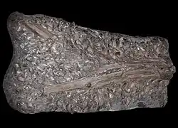 An Osteichthyes, type member of the family Dapediidae inside Holostei. The Dapedium specimen from Úrkút is the first articulated Mesozoic fish body fossil from Hungary that is described in detail.[34] The preserved cranium reveals important characters, although species-level identification is hindered by suboptimal preservation of some diagnostic features.[34]