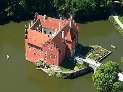 Červená Lhota (German: Roth-Lhotta) is a Renaissance castle in the South Bohemian Region, Czech Republic. It lies in the village of Červená Lhota in the Pluhův Žďár municipality, about 20 kilometres (12 mi) northwest of Jindřichův Hradec. It stands at the middle of a lake on a rocky island. There is also a park, where the Chapel of the Holy Trinity is located.