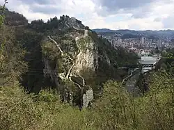 In Užice, Đetinja runs near the remnants of an early mediaeval fortress of Užički Grad located on a steep hill surrounded by deep river canyon-like gorge. The fort originates from the 14th century. The ruins were partially revitalized in the mid-1980s and the next reconstruction, basically a continuation of the 1980s works, ensued in August 2017. For now, the reconstruction of the upper town, middle town and water tower is planned. Part will be conserved and part will be repaired. A possible modernization of the feature, which would include the bridge which would connect the fortress with the Zlatibor road, cable car, museum, hotel, etc., was also considered by the city administration.[16]