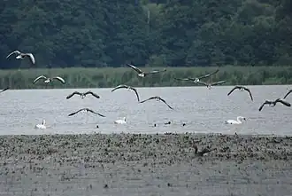 Apart from water and marsh birds, the reserve is home to other bird species, including woodpeckers and birds of prey such as the common buzzard, Eurasian goshawk, common kestrel, Eurasian sparrowhawk, western marsh harrier, European honey buzzard, and black kite. Outside the breeding season, species such as the white-tailed eagle, lesser spotted eagle, osprey, black stork, grey heron, mute swan, and black-headed gull can be spotted.[6][10]
