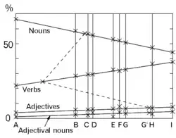 The horizontal axis (in Ōno's formulation) is arbitrary, and should not be interpreted as time. The graph in the re-formulation by Mizutani is more easily interpreted, and shows a scatter plot of nouns versus other word classes.