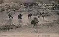 There are two main dyeing processes, one using a dye from the bark of the Techigi tree, and the other, mud. The Techigi tree is cut into chips and boiled down to a thick red liquid. The silk and cotton mats are first dyed in this dye turning them pink, and are then dyed repeatedly in the mud. The fabric goes from a light grey to a reddish brown, and finally to a rich, warm black. The tannin in the dye of the Techigi tree and the iron in the iron-rich mud react to create the black color, unique to Oshima Tsumugi.[15][16]