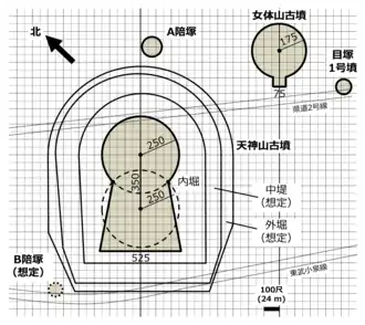 Approximately 300 meters to the Ōta Tenjinyama Kofun is the Nyotaizan Kofun, a large scallop-shaped (帆立貝形古墳) tumulus with has the same orientation and was built at roughly the same time. It has a separate National Historic Site designation. There is also a circular-type (empun (円墳)) tumulus to the north of the Ōta Tenjinyama Kofun, with a diameter of 36 meters and height of 3.2 meters, designated "Tumulus A" on the diagram. The same types of haniwa as the Ōta Tenjinyama Kofun have been discovered an it is believed to be contemporary with that tumulus. Another tumulus, designated "B" on the diaphragm is to the southwest; however, it appears to be a much later construction.