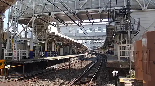 The station consists of two side platforms serving two tracks. The station has three entrances: the south and east entrances adjoining platform 1, and the north entrance adjoining platform 2. Access between the platforms is provided by a footbridge at the west (down) end of the platforms and also be a separate footbridge with lift access. Toilet facilities are provided on both platforms.