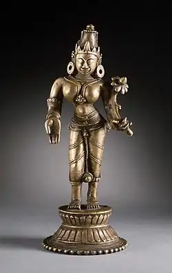 Later Hindu iconography often represents Shri-Lakshmi in the form of Gaja-Lakshmi, standing on a lotus, flanked by two elephants that are shown showering her with water with their trunks.[8][9]