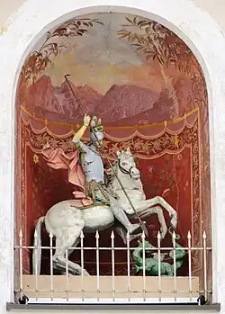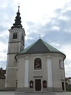 The church in Šenčur is dedicated to Saint George (Slovene: sveti Jurij). It is a single-nave structure with a rectangular chancel with beveled corners that was built in 1747 on the site of an earlier building. The furnishings are Baroque, and the chancel arch features a 1750 fresco painted by Franc Jelovšek (1700–1764). The church also contains paintings by Janez (1850–1889) and Jurij Šubic (1855–1890).[10] The first church at the site was mentioned in written sources in 1238, when Patriarch Berthold of Aquileia granted the church to the monastery at Velesovo.[9][11] During the Middle Ages, the church was surrounded with a fortified wall to protect against Ottoman attacks.[11][12]