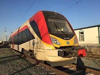 A contract for the purchase of 6 new passenger train sets, manufactured by China's CRRC Corporation at the Zhuzhou Electric Locomotive Works, was signed in 2014. The first train-set arrived in August 2015. Each train consists of 3 rail cars, and is designed to carry 200 passengers. They will be used on routes from Skopje to Bitola, Gevgelija, Kičevo, Kumanovo, and Veles.[2] This is the first time North Macedonia has bought new passenger trains since its independence,[2] and the first time a Chinese EMU or DMU manufacturer has entered the European market.[3]