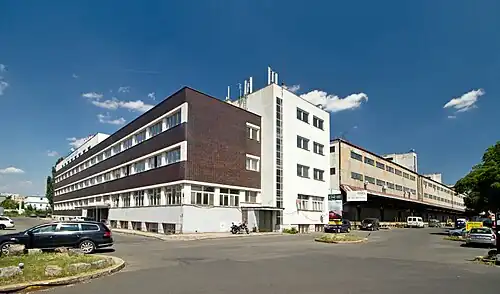 The station, which was built in an area previously known as Červený Dvůr, went into service on 1 March 1936.[1][2] The buildings were designed by Karel Caivas and Vladimír Weiss, whereas Miroslav Chlumecký designed the track infrastructure.[2] The purpose of the station was to relieve Prague city centre of freight train services.[1] It was also used for warehousing, although the creation of a food warehouse in the district of Strašnice in 1966 reduced the demand at the station.[2] The station's formal service ceased in 2002.[3] The access track with a rail branching is used for a container terminal which is adjacent to the freight station building and is in service up to now.