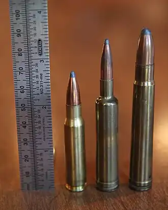 .257 Weatherby Magnum (center) with .308 Winchester (left) and .375 H&H Magnum (right). | ||||||||||||||||||||