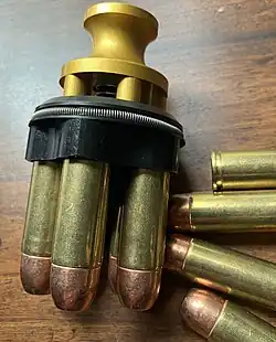 Currently there are several .50 caliber handguns which are capable of firing the .500 S&W Magnum. These types of revolvers normally have five rounds to allow for thicker cylinder walls to accommodate the pressure generated by the large and powerful cartridge. Big Horn Armory's Model 89 carbine and rifle are currently the only repeating long guns chambered in this cartridge. The single shot Thompson-Center Encore, NEF Handi Rifle, and Towner pump rifle are also chambered for this round.[18] Magnum Research manufacturers the single action Big Frame Revolver for the .500 S&W Magnum with barrel lengths up to 10 in (25 cm). Due to the longer cylinders and tighter tolerances typical of these handguns, many shooters have observed higher velocities with the BFR than from the S&W Model 500 while employing the same loadings.[8] It is also loaded in Big Horn Armory's Model 89 lever-action carbine and rifle, which are currently the only repeating long guns chambered in this cartridge.
