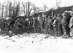 ![]() Men of 104th Field Battery line up for a hot tea ration in Belgium in 1917 | |