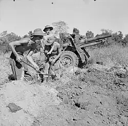 36th Indian Division was in training for amphibious operations. 455 Light Bty had previously served in the assault force for the invasion of Madagascar (Operation Ironclad) under the division's commander, Maj-Gen Francis Festing. Now the two field regiments assigned to the division, 130th (Lowland) and 178th, were designated 'Assault Field Regiments' trained for assault landings from the sea, possibly against Akyab or the Andaman Islands. 130th (Lowland) Assault Fd Rgt was equipped with 16 × 25-pdrs (315 and 316 Fd Btys) and 16 × 3.7-inch howitzers (455 Lt and 494 Fd Btys).[20][30][31][32][33]