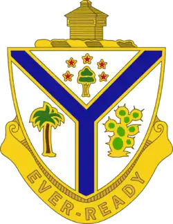 The palm tree recalls Cuban and the cactus the Mexican border service. The crest is that of the Illinois Army National Guard. The motto "Ever Ready" was later amended into Latin "Semper Paratus."[2]