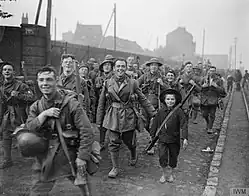 Men of the 8th (Liverpool Irish) Battalion of the King's (Liverpool Regiment) entering Lille, France, 18 October 1918. Note a barefooted French boy with a rifle, clearly given to him by a smiling British soldier on his right.