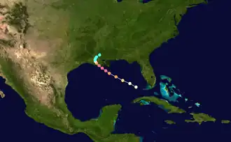 The cyclone was first detected in the eastern Gulf of Mexico 125 miles (201 km) west-northwest of Key West, Florida, on August 8, 1856. Because it was already a hurricane when it was first observed, it probably had developed further east than here. It advanced steadily northwest, strengthening to the equivalent of a Category 3 hurricane. The hurricane gradually slowed prior to landfall on August 10, and it attained its estimated peak intensity of 150 mph (240 km/h). It was a tropical cyclone of small diameter, and its maximum sustained winds may have reached Category 5 status, but were unrecorded. During the early evening of August 10 the northeastern edge of the eye crossed over Last Island (Official name: Isle Dernière) before making landfall a few hours later south of New Iberia, Louisiana. The cyclone is believed to have struck southern Louisiana at peak intensity with an approximate central pressure of 934 mbar (27.6 inHg).[2] A ship reported a peripheral pressure of 955 mbar (28.2 inHg),[3] so a lower pressure was based on the small size of the hurricane. It quickly weakened over land, and it diminished to a tropical storm on August 11. It dissipated over southwestern Mississippi on August 12 with fully tropical characteristics.[2]