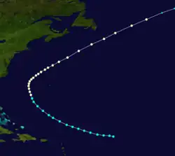 On August 24, the bark N. Boynton encountered a hurricane to the northeast of the Leeward Islands,[9]: 36  with the official track initiated about 400 mi (640 km) from Barbuda. This storm moved on a similar path to the previous, trekking west-northwestward and then northwestward, followed by a turn to the north on August 27. Intensification occurred during this time, and early the next day, the cyclone reached major hurricane status, becoming a Category 3 hurricane on the present-day Saffir–Simpson scale while passing west of Bermuda.[6] A brig known as Daphne observed a barometric pressure of 948 mbar (28.0 inHg) on August 29.[9]: 37  Based on this, the Atlantic hurricane reanalysis project estimated that this storm attained peak winds of 125 mph (205 km/h).[4] The storm then turned northeastward and gradually weakened. Late on August 30, the system passed near Newfoundland as a Category 1 hurricane and soon transitioned into an extratropical cyclone. The extratropical storm persisted until September 2, when it struck the British Isles at hurricane-equivalent intensity and lost its identity over East Anglia.[6]