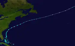 On October 22, the schooners Etna and Mahaska encountered this storm offshore South Carolina,[9]: 46  leading to the track beginning on that date just north of the Abaco Islands in the Bahamas. The storm initially moved to the north, before curving northeastward by the following day. Only slight intensification likely occurred, with the system peaking with winds of 60 mph (95 km/h) early on October 24. Several hours later, however, the storm transitioned into an extratropical cyclone about halfway between Bermuda and Nova Scotia. Before dissipating northwest of Ireland on October 28, the extratropical remnants reached hurricane-equivalent intensity over the northern Atlantic,[6] based on the ship Rhaetia recording sustained winds of 81 mph (130 km/h) and a minimum barometric pressure of 983 mbar (29.0 inHg).[9]: 46–47
