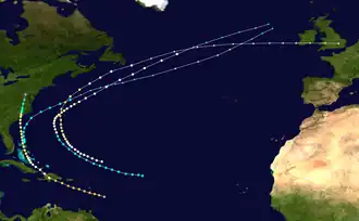 Three September 4–13 Category 3 hurricane 125 (205) 955 Lesser Antilles, Greater Antilles (the Dominican Republic), the Bahamas, East Coast of the United States (North Carolina) >$520,000 206 [9]: 42 [8]: 3, 17 [19][21]: 17