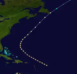 After peak intensity, the storm began to weaken and fell to Category 2 strength on August 29. Later that day, the hurricane began re-curving northward and then accelerated northeastward on August 30.[2] Although the storm passed well offshore the East Coast of the United States, rough seas caused "great damage" at beaches in New Jersey. While approaching Newfoundland on September 1, the system weakened to a Category 1 hurricane. Late on September 1, it weakened to a tropical storm, shortly before becoming extratropical about 465 miles (750 km) east-northeast of St. Lunaire-Griquet, Newfoundland and Labrador.[2]