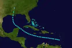 After no activity for over two months, the barque Aspatogan encountered "very heavy weather" associated with a tropical storm in the eastern Caribbean Sea on August 18.[3] The system moved west-northwestward across the Caribbean Sea and strengthened slowly. Early on August 24, the storm attained its maximum sustained winds of 60 mph (95 km/h), while situated about 80 miles (130 km) south-southwest of Grand Cayman. Re-curving northwestward, it brushed the Yucatan Peninsula on August 25, shortly before entering the Gulf of Mexico. The storm again re-curved northward while located in the central Gulf of Mexico. At 1600 UTC, it made landfall near Dulac, Louisiana with winds of 60 mph (95 km/h). The system quickly weakened to a tropical depression and dissipated over northern Mississippi on August 28.[2]