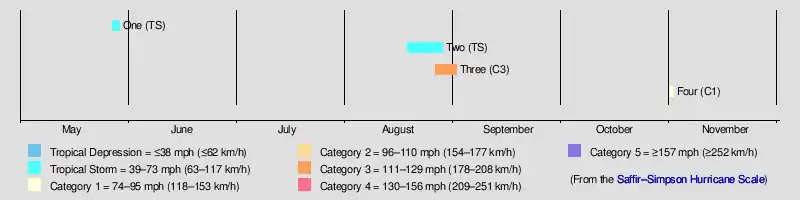 Of the season's four tropical cyclones, two reached hurricane status. One of these two strengthened into a major hurricane, which are Category 3 or higher on the modern-day Saffir–Simpson hurricane wind scale. The strongest cyclone of the season, the third hurricane, peaked at Category 3 strength, with maximum sustained winds of 120 mph (195 km/h). Rough seas produced by this storm sunk a ship in the vicinity of the Lesser Antilles, drowning 10 people. The final tropical cyclone was first observed in the southwestern Caribbean Sea on October 31. Peaking as a strong Category 1 hurricane, it headed westward and made landfall in Nicaragua, before being last noted over Central America on November 1. The storm produced only minor damage in Nicaragua. Collectively, the tropical cyclones of this season resulted in at least $1 million in damage and 14 confirmed fatalities.