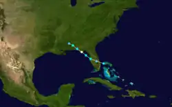 A tropical depression formed over the northwestern Caribbean on September 25. Moving northeastward, the depression brushed Cuba's Isla de la Juventud on the following day and then made landfall on the main island along the north shore of the Gulf of Batabanó.[3] Havana observed a barometric pressure of 1,008 mbar (29.8 inHg),[4] the lowest in relation to the storm. Thereafter, the cyclone emerged into the Straits of Florida late on September 26 and then intensified into a tropical storm early the next day. Throughout September 27, the system crossed the northwestern Bahamas, including striking the Abaco Islands with winds of 50 mph (85 km/h).[3] After exiting the Bahamas on September 28, the cyclone weakened, possibly due to the approach of the previous storm, and was last noted several hours later.[4]