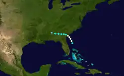 Although the steamship Philadelphia first encountered this storm north of Puerto Rico on September 27, a 1993 reanalysis by meteorologist C. J. Neumann began the track for this system about 200 mi (320 km) east of Guadeloupe two days earlier.[4][3] Traveling northwest, the storm intensified into a hurricane on September 26 and then into a Category 2 hurricane on September 27. While nearing the coast of the Southeastern United States, the cyclone became a Category 3 hurricane early on October 1 and then a Category 4 hurricane the next day. Around 12:00 UTC on October 2, the storm peaked with maximum sustained winds of 130 mph (215 km/h) and a minimum barometric pressure of 938 mbar (27.7 inHg). The hurricane then made landfall on Cumberland Island, Georgia, four hours later at the same intensity. Early on October 3, the system weakened to a tropical storm over west-central Georgia and a tropical depression over northeastern Alabama several hours later. The cyclone turned northeastward over Indiana and then east-northeastward over Ontario. After emerging into the Gulf of St. Lawrence, the storm struck Newfoundland on October 6 and promptly dissipated.[3]